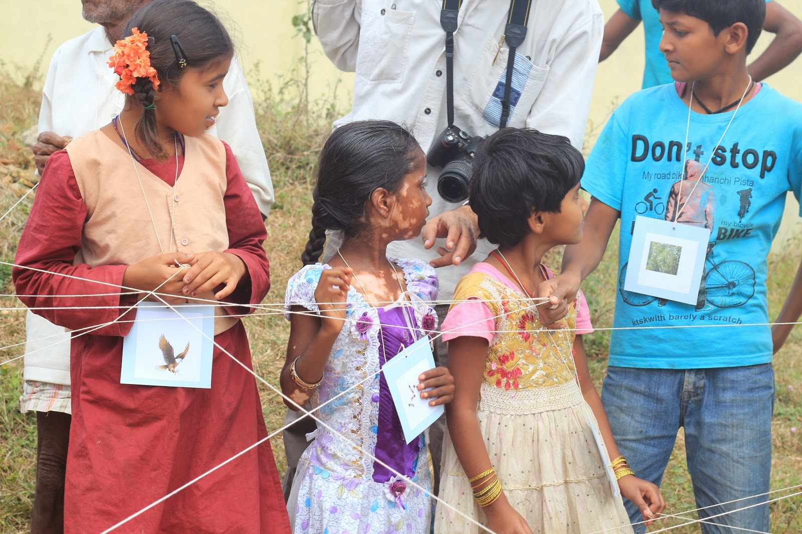 This was the perfect time to rope in all the adults present for the next activity, Web of Life. Everybody, including the adults, were asked to stand in a big circle and each one of them was given a chart with the picture of a tree/plant/grass or animal/insect/fish/bird on it, with a lanyard to wear round the neck.